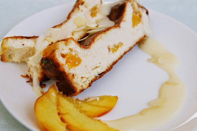 Інгредієнти: 500 грамів кисломолочного сиру, 3 яйця, 120 грамів цукру, цедра одного лимона, 1 столова ложка крохмалю або стільки ж манної крупи, 0,5 чайної ложки куркуми, півсклянки сушених вишень без кісточок, ванільний цукор до смаку.