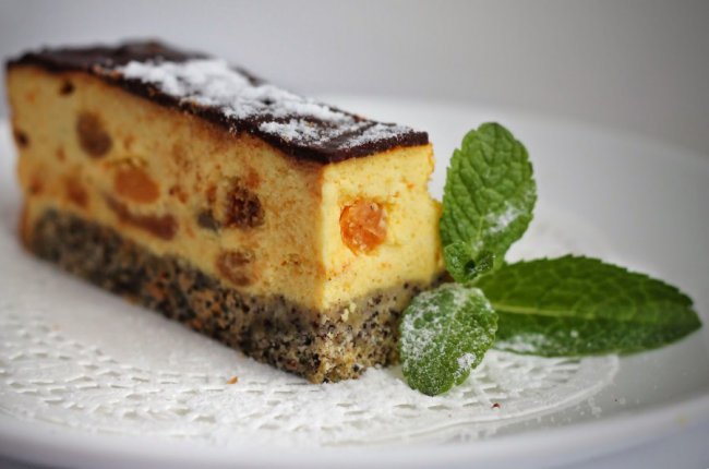 Рецепт. Сир перетерти з цукром і додати окремо збиті яйця, добре вимішати. До сирної маси додати манку, крохмаль, ванільний цукор, масло, цедру лимона і вимішати міксером. Додати декілька столових ложок сирної суміші до попередньо запареного і перетертого маку, ретельно вимішати і викласти у форму для запікання. Зверху викласти сирну масу, змішану з родзинками, і помістити в розігріту духовку. Випікати близько години при температурі 180º. Коли сирник охолоне, полити його шоколадною помадкою і притрусити цукровою пудрою.