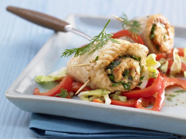 Рибне філе злегка відбити плоским боком ножа, посолити і поперчити. На кожне філе викласти начинку, згорнути у формі рулетика, сколоти зубочисткою, запанірувати у борошні і обсмажити у олії з усіх боків.
