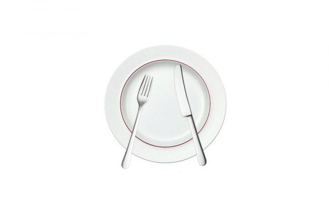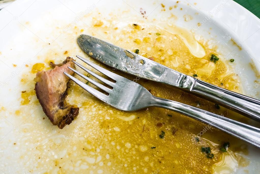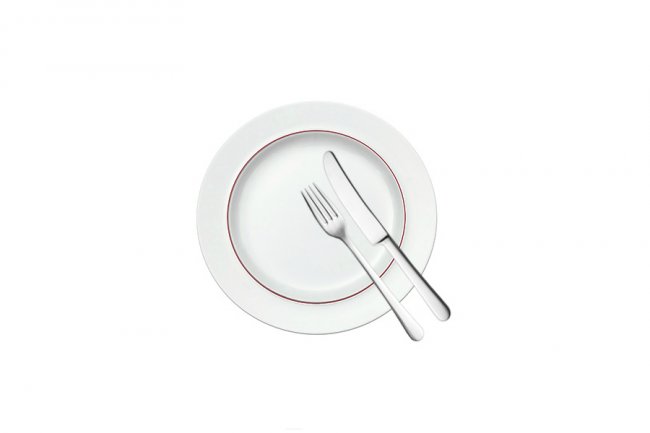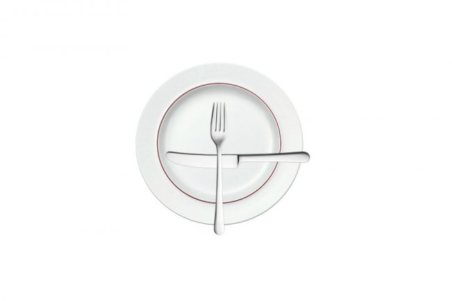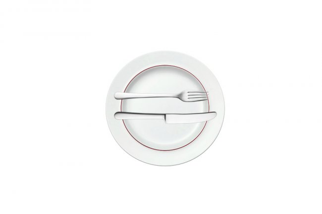 Ніж та виделка лежать паралельно одна до одної, лезом та зубцями доверху, а ручками вниз. Також велика відстань між зубцями виделки та лезом ножа говорить про те, що страва ситна і її було вдосталь.