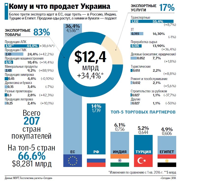Згідно з даними Міністерства економічного розвитку і торгівлі, а також даними Держстату, 36,4% українських поставок йдуть в Євросоюз, 16,2% – в країни Азії і лише 14% – в Росію.