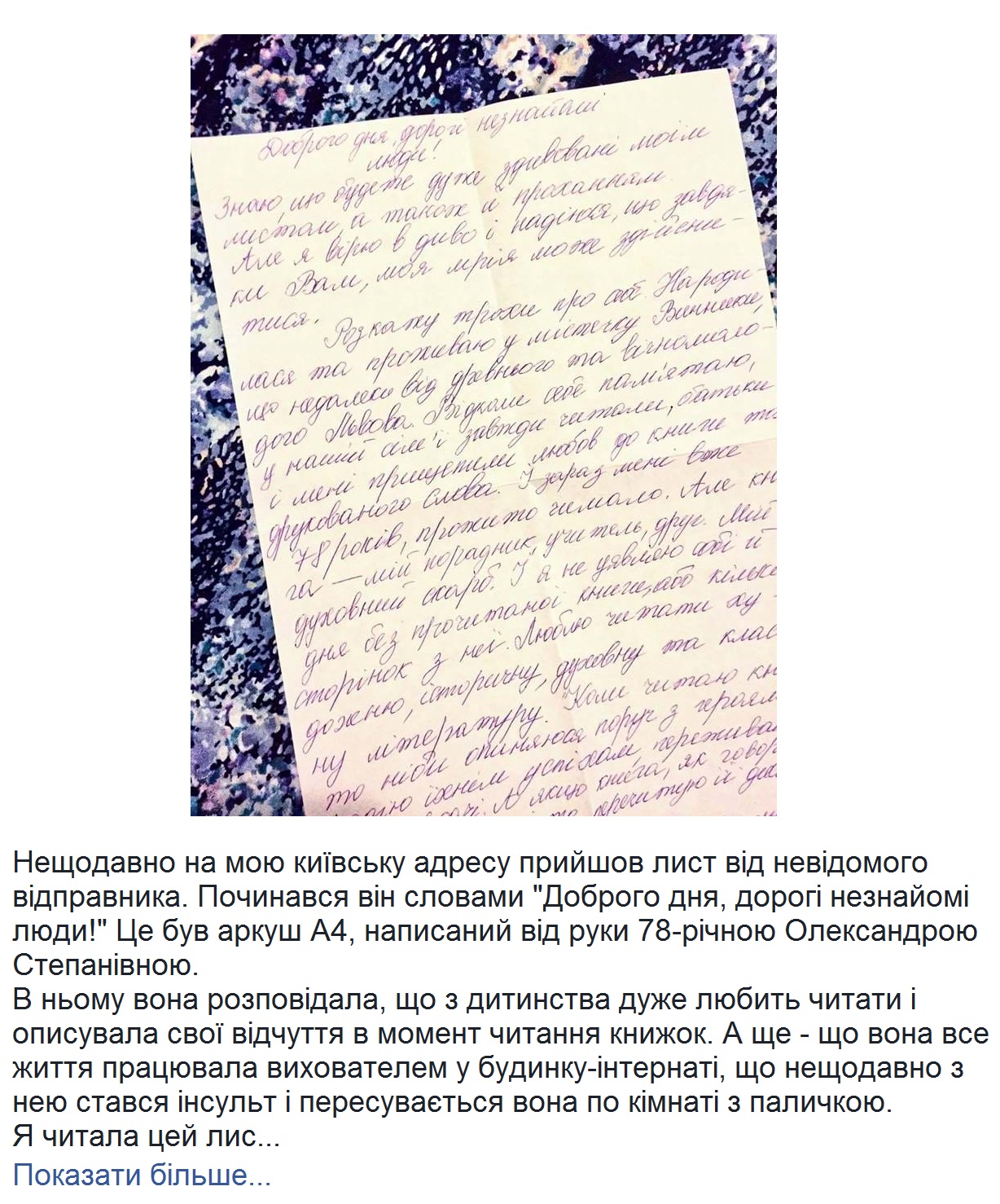 За її словами, нещодавно на її київську адресу прийшов лист від невідомого відправника. Це був лист формату А-4, написаний 78-річною Олександрою Степанівною. Починався він словами: "Добрий день, дорогі незнайомі люди".