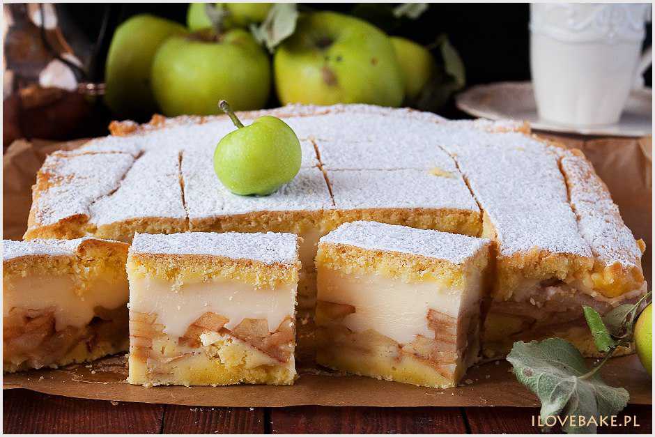 Розподілити половину тіста на нижній частині форми. Зверху помістити яблука і залити ще теплим заварним кремом.