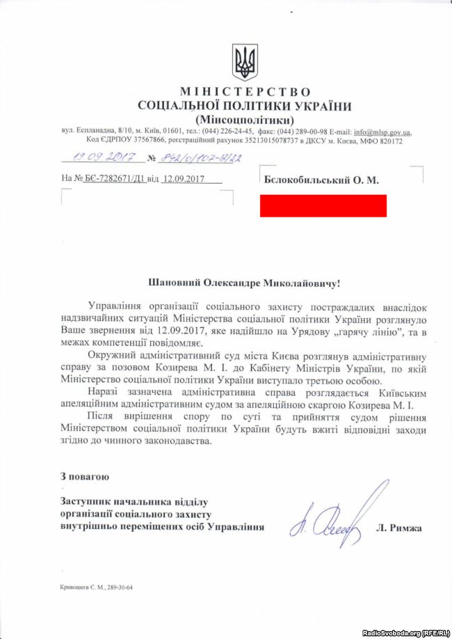 «Наразі зазначена адміністративна справа розглядається Київським апеляційним адміністративним судом за апеляційною скаргою Козирева М.І. Після вирішення спору по суті та прийняття судом рішення Міністерством соціальної політики України будуть вжиті відповідні заходи згідно до чинного законодавства», – пише заступник начальника відділу організації соціального захисту внутрішньо переміщених осіб Управління організації соціального захисту постраждалих внаслідок надзвичайних ситуацій Л.Римжа.