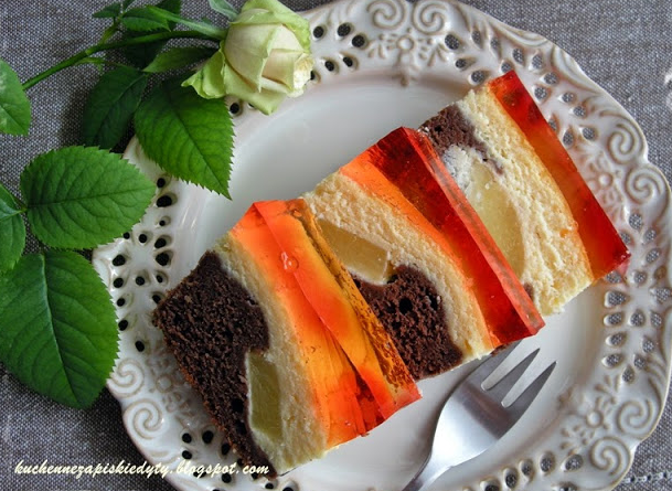 Персикове желе розчиніть в 3 склянках окропу(700 мл), полуничне желе у 350 мл, охолодіть до густого стану. Персикове желе вилийте на пляцок а потім покладіть по ложці полуничного желе, щоб з'явилися барвисті плями.
