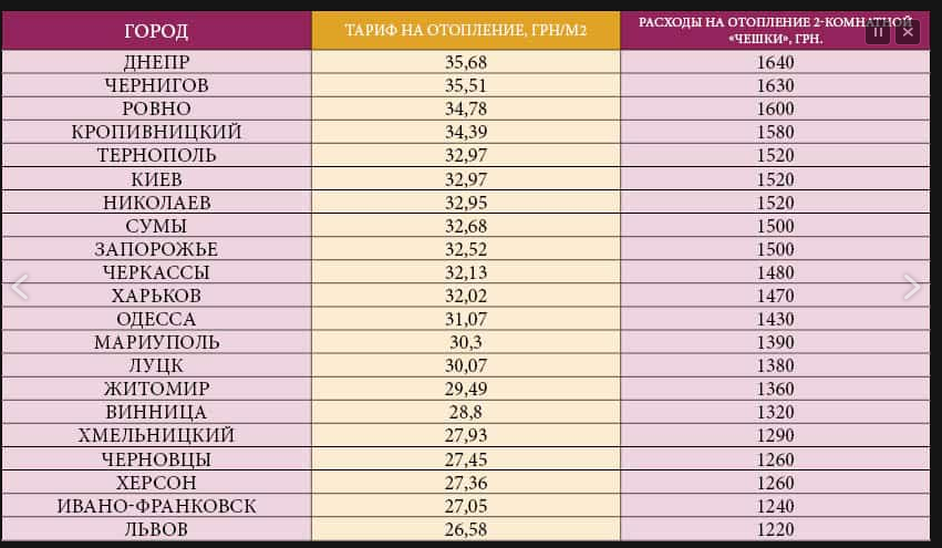 Найвищі тарифи в Україні досягають 40-45 гривень. У Сєвєродонецьку (Луганська область) жителі і зовсім платять 46,24 гривні за метр. Таким чином опалення 2-кімнатної квартири обходиться їм в 2124 гривні.