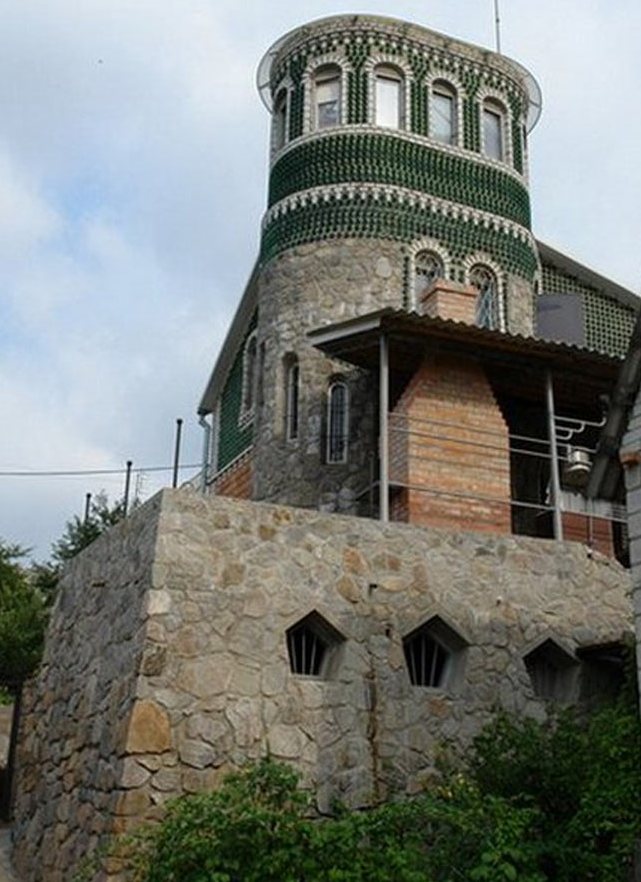 Цей химерного вигляду будинок в дачному селищі в передмісті Запоріжжя Володимир Сиса зводив майже 20 років. Ще до закінчення будівництва дачі сусіди охрестили її архітектурним шедевром. І не дивно, адже для реалізації своєї мрії пенсіонер використовував вельми незвичайний матеріал — пляшки з-під шампанського!