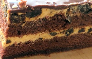 Шоколадний корж просочуємо половиною алкоголю, що залишився після настоювання чорносливу. Зверху викладаємо половину крему, вирівнюємо, накриваємо другим коржем, просочуємо рештою алкоголю та змащуємо рештою крему.