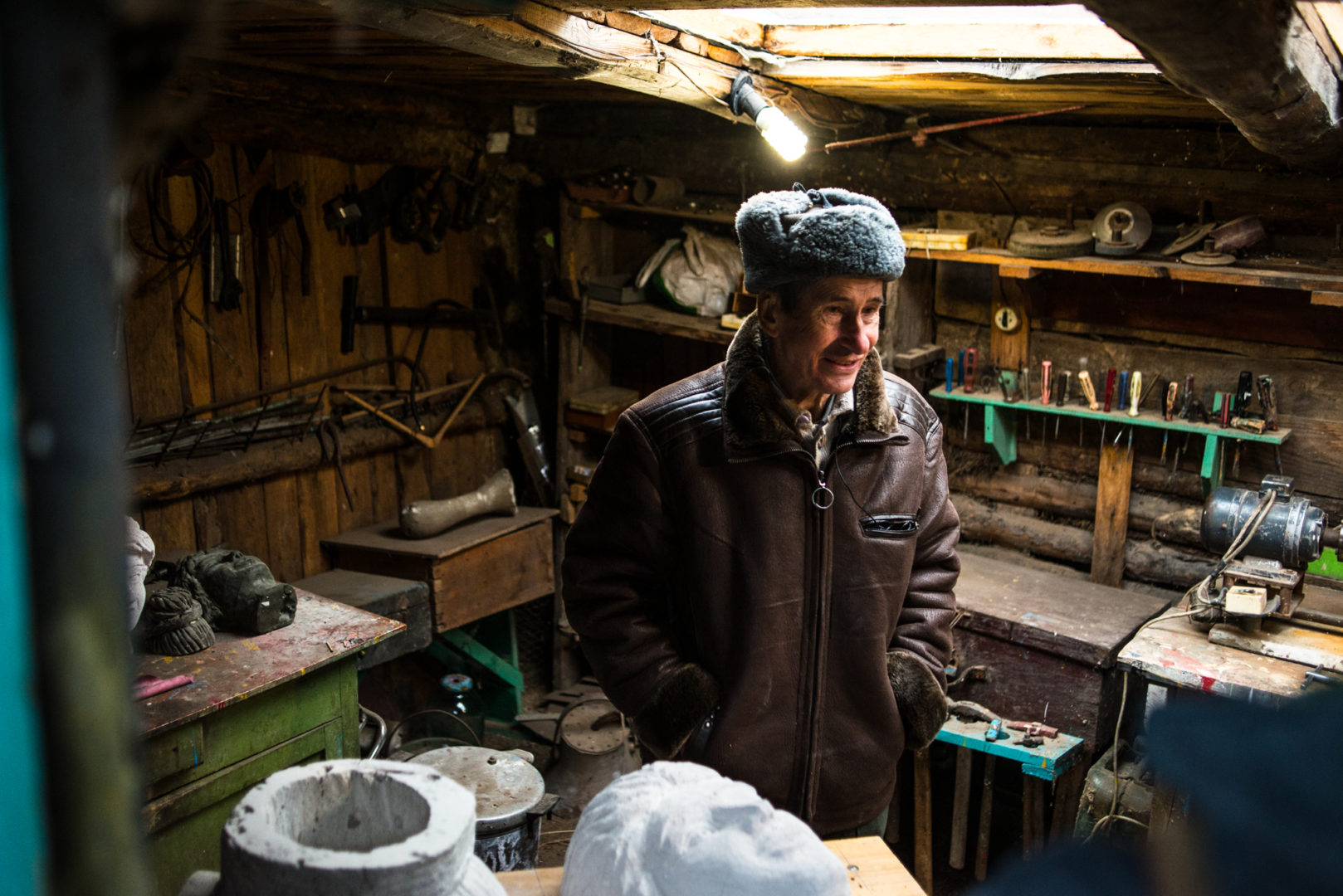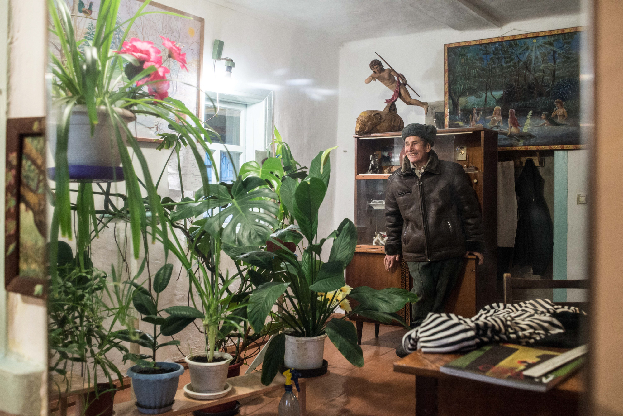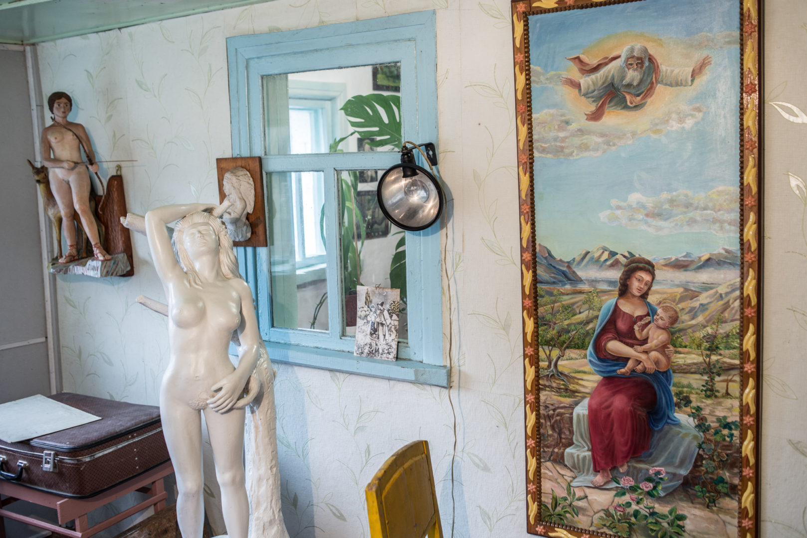 Скульптор запрошує нас до хати. У кімнатах зелено — вазони від дружини залишились, то він їх і доглядає. Все заставлено скульптурами та картинами. У кутку стоїть одна незавершена робота. Валерій каже, що не дочекається зими, аби невилазно сидіти вдома й допрацьовувати почате: