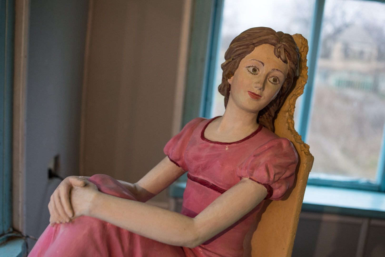 — А ось це — Мавка із «Лісової пісні». Коли почув про неї — зачепила до сліз. Зараз багато режисерів роблять кіно за її мотивами. От і мені захотілось зробити щось своє. Але не скажу, що вона вдала… Хочу її переробити, зробити більш витонченою — не влаштовує вона мене такою. Дуже давно її зробив із пластиліну, вона потім розтанула під сонцем, то я її відновив і зробив цементною. Тепер їй ніщо не загрожує.