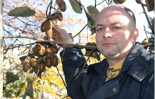 На плантації площею 1,3 гектара ківі в'ється по шпалері. Чоловік збирає коричневі плоди, кладе у відра. Один плід, каже, важить 80 - 100 грамів. "Якщо надумаєте вирощувати ківі, то ось декілька порад. Висаджувати їх краще навесні, коли температура вночі перевищує десять градусів тепла. Саджанці варто заглиблювати максимум на 50 - 70 сантиметрів. Ліани добре розвиваються на чорноземах та піщаних грунтах. Не люблять лише глинисту землю. Ківі має поверхневу кореневу систему, коріння розгалужуються в радіусі півтора-два метри", - каже чоловік.