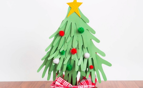Цей варіант підійде для всієї родини. Підготуйте декілька аркушів паперу А-4, картон та ножиці. З картону виріжте фігуру ялинки, а з паперу “ручки”. Наклейте їх на картон.