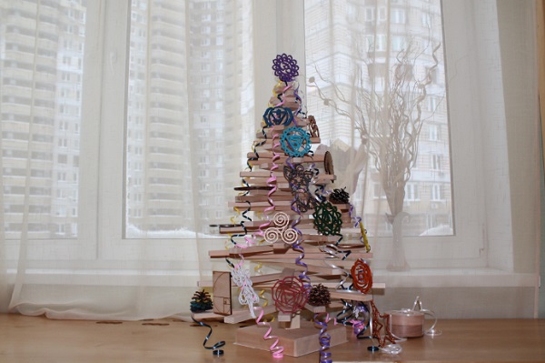 Цікавим варіантом буде ялинка із дерев’яних брусків, яка утворює піраміду. За давніми віруваннями, піраміда – це символ життя та смерті.