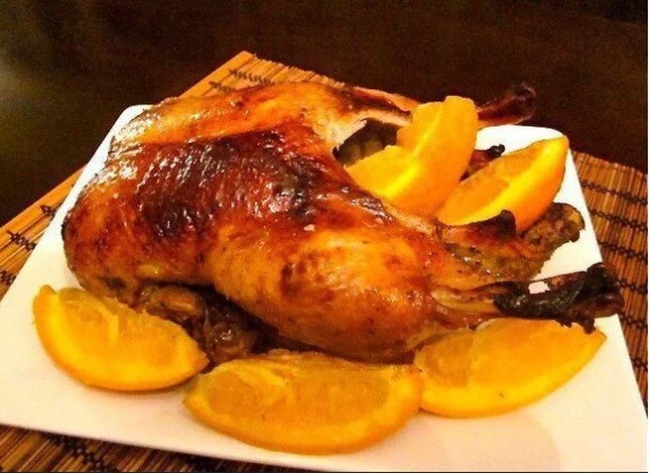 Для карамелі: 1 склянка апельсинового соку; 1 ст. л. апельсинового лікеру або коньяку; 1 ч. л. соєвого соусу; 2 ст. л. меду.