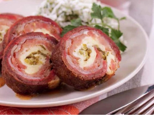 Складові: 500 г яловичої вирізки; 40 г бекону; 70 г шинки; 2 мариновані огірки; 2 курячих яйця; 1 ч. л. рослинної олії; сіль, перець за смаком.