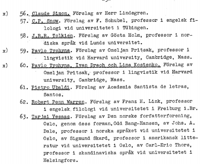 Усього в оприлюдненому списку 70 письменників, зокрема Хорхе Луїс Борхес, Семюель Беккет, Пабло Неруда, Костянтін Паустовскій та автор трилогії “Володар кілець” Джон Толкін.