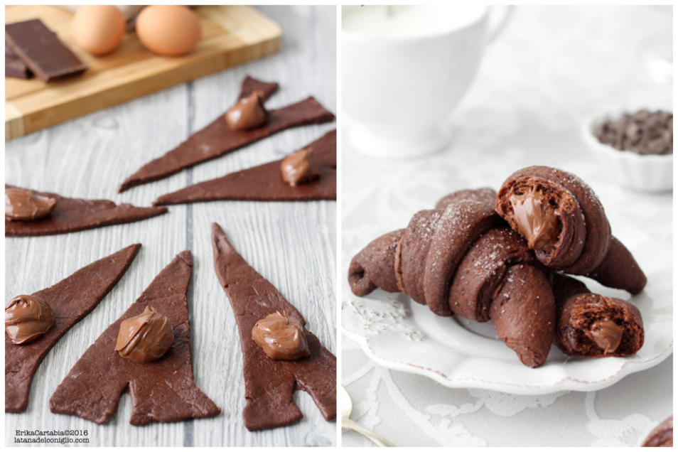 Потім наповнити його щедро 1 чайною ложкою горіхово-шоколадного крему (наприклад Нутелли). Починаючи від основи, а потім продовжити згортати тісто до кінчика, щоб сформувати круасани.