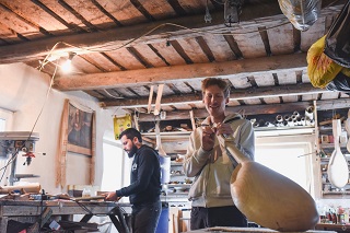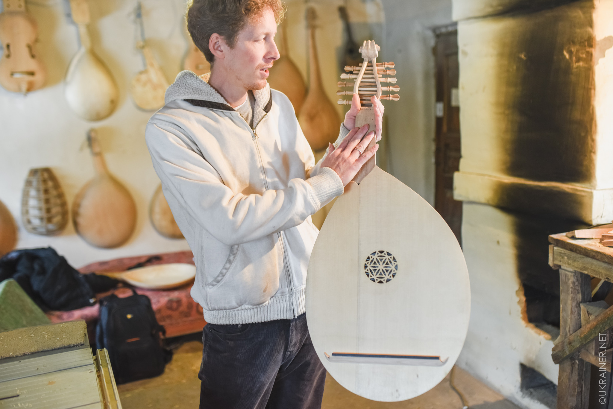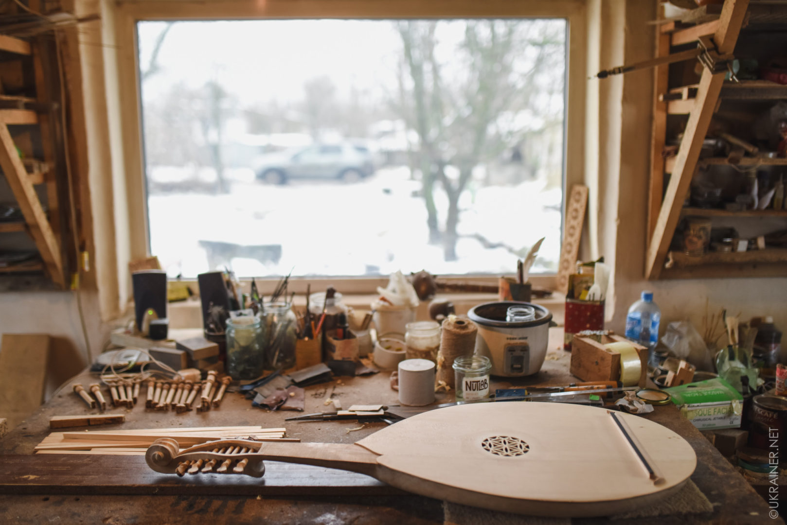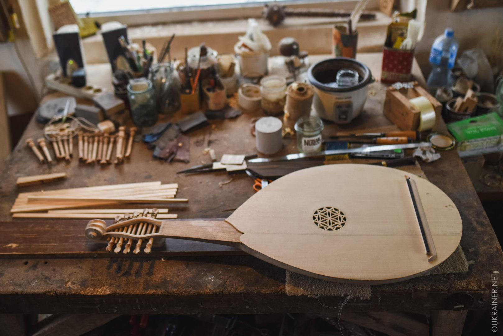 — Тоді я мав якраз можливості самому робити, я мав дерево. У мене інструменту не було, тоді я почав робити перші кобзи. Сподобався сам процес майстрування. У дитинстві я любив конструктори Lego. А це ніби дорослі іграшки. Ти робиш те, що ти хочеш. Я вже зробив не тільки бандури й кобзи, я вже роблю найскладніші інструменти українські. Один із найскладніших — це торбан. І я вже на ньому граю. Але я не думаю зупинятися. Це може бути гарний і прибутковий фах, але насправді, я зараз не заробляю на цьому нічого. Та я хочу робити ще кращі інструменти. Бандура, яку я зараз роблю, має бути ще краща, ніж попередні. Вона особлива за звуком, за формою, навіть за орнаментом. Попередні бандури набагато важчі, у них металеві струни, у моєї будуть нейлонові. Тут дуже тонка дека. Дуже резонансний інструмент. Більшість бандур робиться з верби, а ця — з клену. На цій бандурі буде можливість стискати гриф, а не просто грати, як на арфі. Інструменти мають бути традиційні, але в нас так мало залишилося традиційних інструментів, що, я вважаю, можна робити інструмент ще кращим.