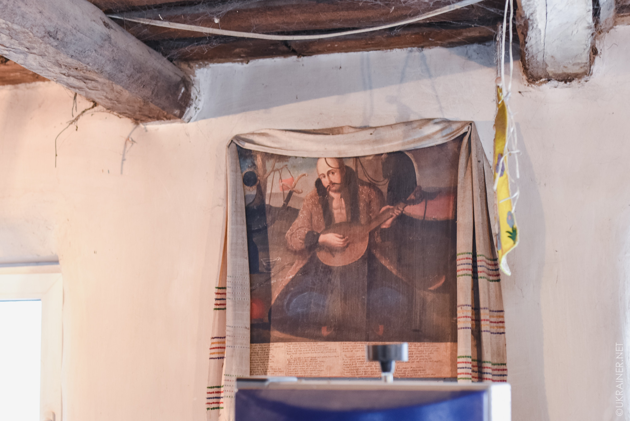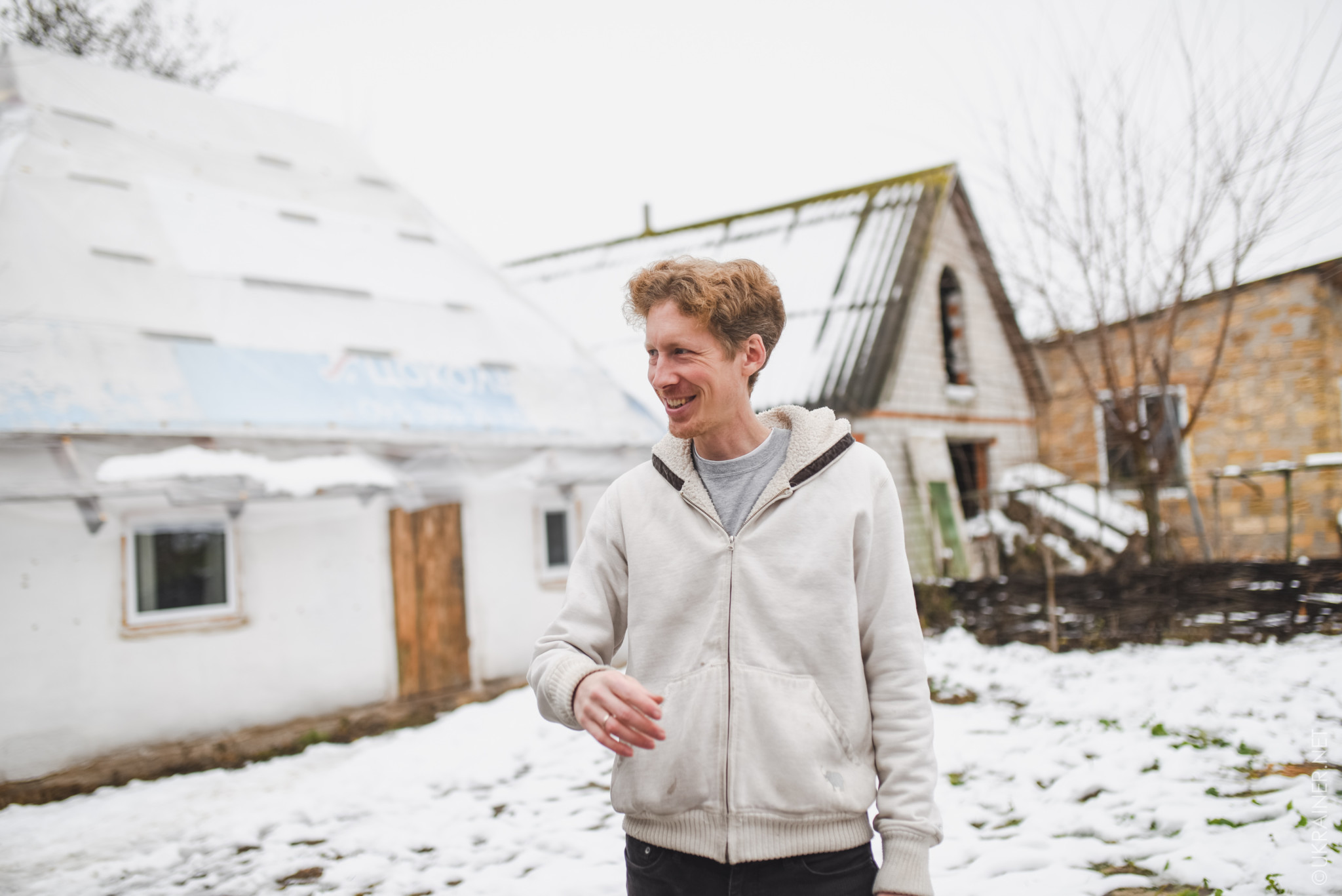 — Це супер теплий дім, тут одна маленька піч усе зігріє. Учні мої тут живуть. Ми це робили, як студію для запису диску з Древо. У мене є апаратура для праці з іншими гуртами: Хорея Козацька, Карпатяни. Ми робимо якісні записи. Я називаю це місце церква-хата, але це також і перший музейний об’єкт, де ми інструменти можемо представити. Це не мазанка, хоч і виглядає подібно до мазанки. Це американська тюкова хатка. Тюки просто складаються, компресуються, потім мажеться глиняно-піщана суміш. Але я будував таку маленьку хатку, щоби зрозуміти технологію, коли будуватиму музей — потрібна буде більша. І я хочу знати, чи буде вона стояти. Сусіди не вірили: сказали, що миші все поїдять. І миші таки трошки там лізуть. Треба дірки закрити і, можливо, отруту поставити чи котика, щоби тут жив. І я вже готовий робити щось більше своїми руками, я не сумніваюся. Це буде дешево, тепло й достойно.