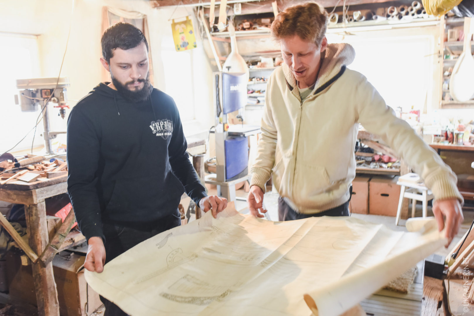 У мене є всякі креслення по кобзі, по бандурі, по торбану. Ми їх самі робимо частіше. Це точні креслення, щоби ми знали, як робити найменші деталі. Я зробив уже десь 20 інструментів. Важко сказати точно, скільки часу йде на окремий інструмент, бо я займаюсь декількома одразу, зазвичай. Зараз я майструю й кобзу, і торбан. Це трохи важко, але я маю вибір на кожен день. Це також важливо для натхнення.