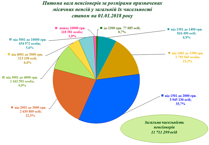 У той же час, пенсії, які перевищують 10 тис. гривень, до початку 2018 року одержував 118,381 пенсіонер, або 1,01% від їхньої загальної кількості. За останній рік кількість таких пенсіонерів збільшилася на 99,309 тис. осіб.