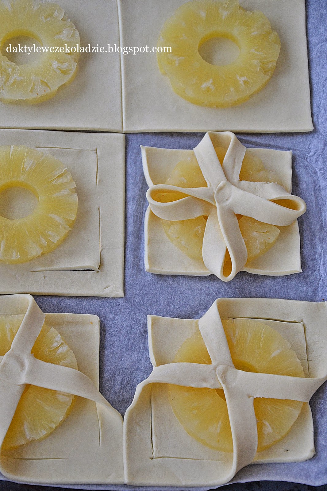 Тісто розморозити, розгорнути і нарізати на квадрати зі сторонами приблизно 11 см. Обережно злийте сироп з ананасів. Помістіть  шматочок ананаса в середині кожного квадрата(як на фото).  Розріжте тісто, як показано на малюнку, кожен кут на відстані близько 1 см від краю, довжиною близько 4 см. У центрі кожної сторони залиште близько 2 см тіста. Дві протилежні сторони з'єднуються  одна з одною. Зробіть те ж саме з двох інших боків.