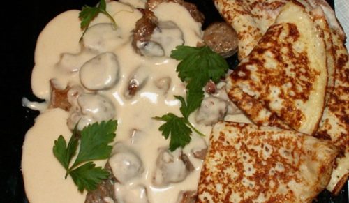 Поріжте ріпчасту цибулю на дрібненькі кубики, посоліть і покладіть на розігріту пательню з олією, щоб гарно засмажилася. Поки смажиться, розведіть у склянці молока столову ложку з горбиком борошна. Гарно вимішайте в однорідну масу. Можна додати улюблені спеції. Коли цибуля набуде золотистого кольору, вилийте на пательню, безперервно помішуючи, розведену молочно-борошняну суміш. Помішуйте, щоб борошно не збилося в глюдзики.