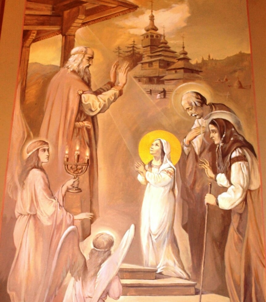 У вівтарі неподалік зображення Богородиці, художник намалював ангелів, які грають на українських музичних інструментах. А на арках художник зобразив 11 чудотворних ікон зі всієї західної України. Також у церкві є понад 50 зображень автентичних архітектурних сакральних споруд – католицьких церков зі всього світу. Окрім церков та святих у вишиванках на стінах храму зображено багато елементів українського побуту.