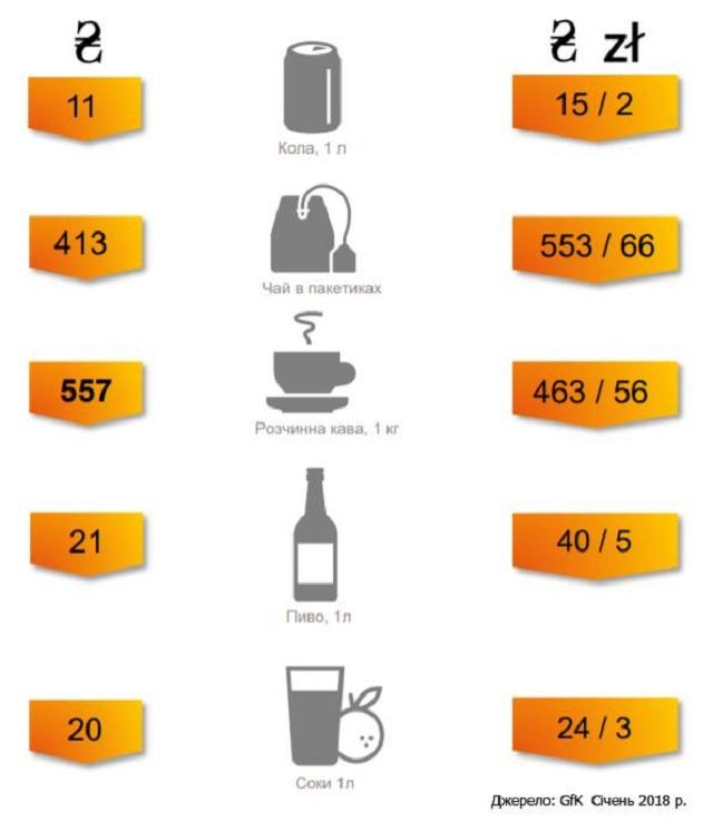 Натомість ультрапастеризоване молоко та розчинна кава є набагато дешевшими у наших західних сусідів: за кілограм кави українцю доведеться віддати на 94 гривні більше, ніж поляку.