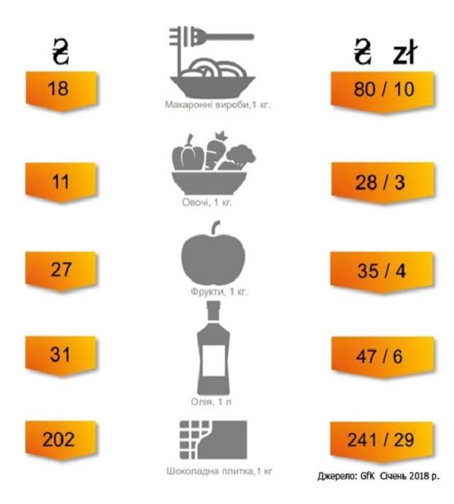 Дослідницька компанія GFK порівняла ціни на продукти харчування в Україні та Польщі.
