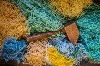 Нитки фарбує Євген. Родина Пілюгіних купує натуральну овечу вовну природного білого кольору. Нитки фарбують сучасними стійкими барвниками для вовни.