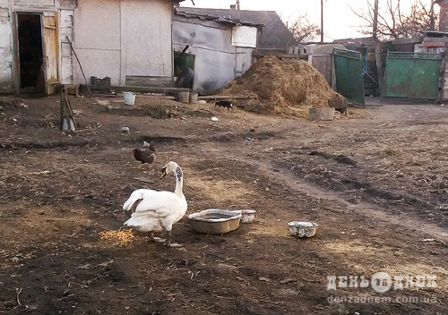 — Вже кілька днів у нас живе, — розповідає 64-річна Майя Андрощук, власниця птаха. — Він йшов зі ставка по проїжджій частині. Був дуже брудний і наляканий. Коли відкрила хвіртку, охоче зайшов на подвір’я. Думаю, що він втратив свою пару і його вигнали зі зграї, а бродячі собаки налякали.