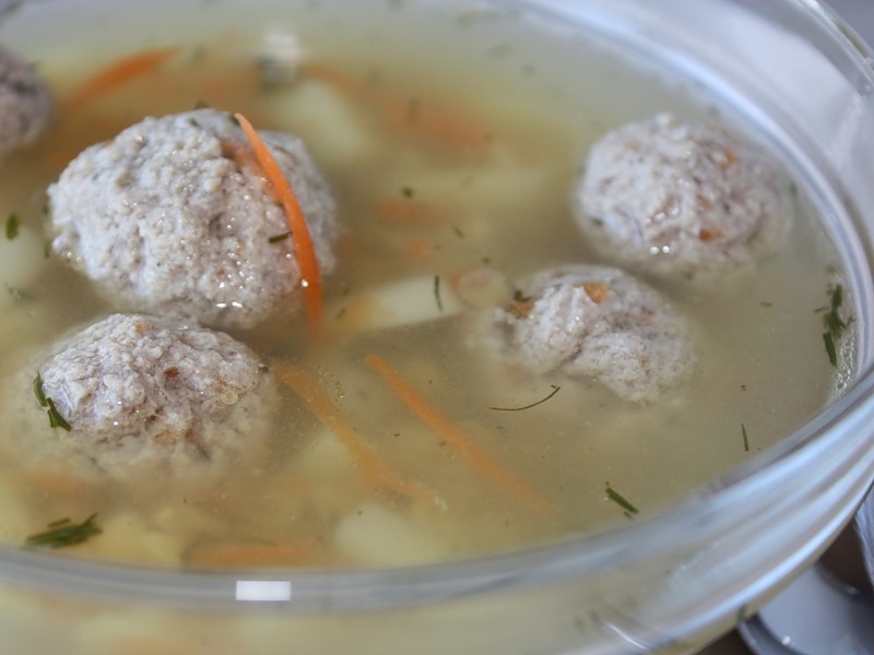 Бульйон доведіть до кипіння. З фаршу сформуйте фрикадельки, по черзі опускайте кожну в бульйон, постійно помішуйте. Коли фрикадельки спливуть, знімайте суп з вогню.