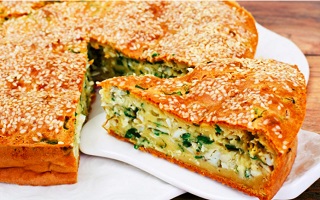 3. Збираємо пиріг: половину тіста вилити в змащену маслом форму. Викласти начинку і зверху розподілити решту тіста. Посипати пиріг кунжутом.