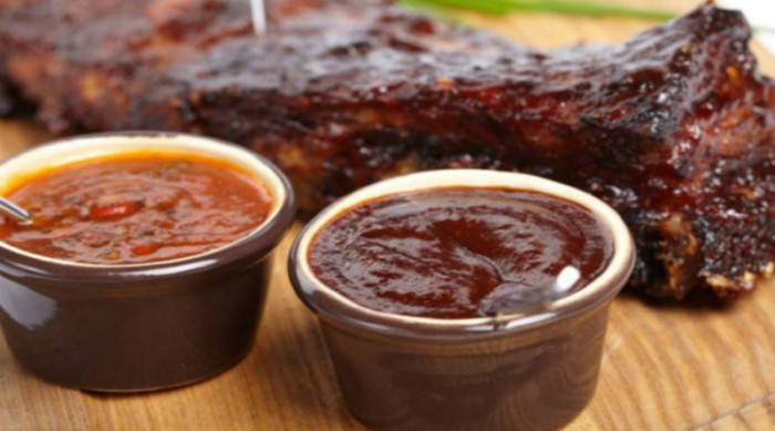 Цибулю нарізати, додати воду і за допомогою блендера подрібнити до консистенції пюре. На середньому вогні розігріти оливкову олію, додати до неї цибулеве пюре. Варити, поки суміш злегка не підрум’яниться. Додати інші інгредієнти (часник пропустити через прес) і, постійно помішуючи, тримати на вогні ще 20 хвилин. Соус вийде дуже ароматний, прекрасно підходить для реберець.