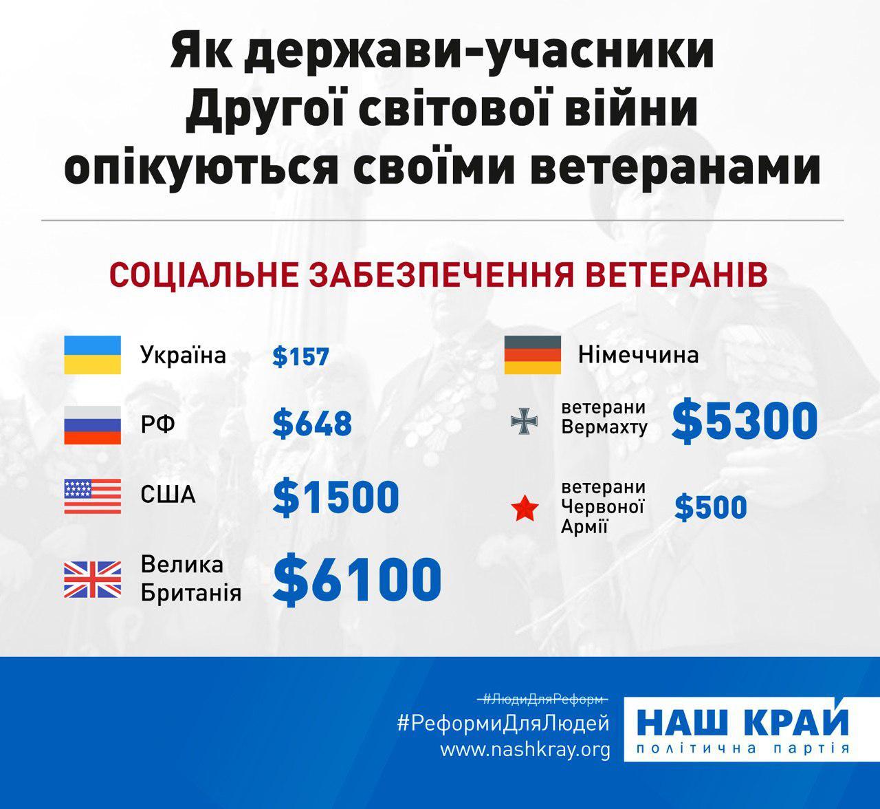 Пенсії ветеранів Другої світової війни, які живуть в Україні, найменші у порівняні із пенсіями ветеранів у інших країнах. Інфографіку із порівнянням пенсій ветеранів у різних країнах опублікувала на своїй сторінці у Фейсбук партія “ Наш край”.