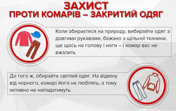 Краще запобігти укусам комах, ніж боротися з їх наслідками. Тому, щоб забезпечити себе й своє здоров’я від набридливих комарів, слід захищатися. Найбезпечніший "нехімічний" захист – закритий одяг. Тож на природу карще вибирайте одяг з довгими рукавами, бажано з щільної тканини, ще щось на голову, а на ноги штани – і комар до вас не добереться.