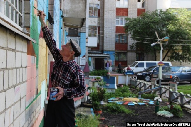 А все розпочалось у 2014 році, коли літній чоловік замінив вікно у помешканні і вирішив зовні розмалювати довкола стіну, «для краси». Захоплення його не покидає четвертий рік поспіль. Щодня пенсіонер виходить на вулицю і творить кольоровий світ для себе і сусідів. Не нарікає на комунальні служби, а старається змінити місце, де проживає. У перший рік доводилось прибирати сміття чи лагодити зламані речі, але тепер люди навчились шанувати те, що робить їхній сусід. Фарби чоловік спершу купував сам, зараз трішки допомагають і сусіди, які просять розмалювати стіни і довкола їхнього під’їзду.