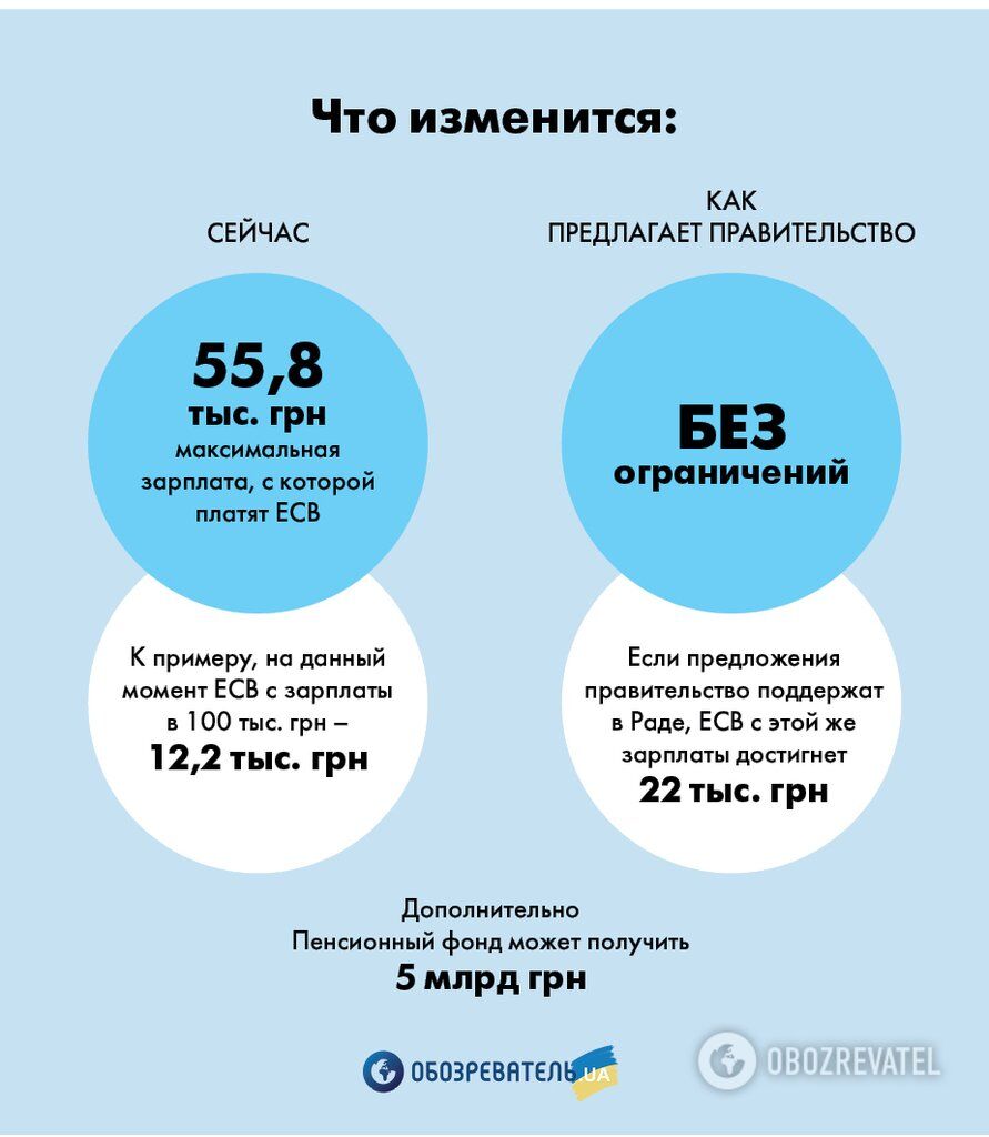 Ще кілька місяців тому Міністерство соцполітики знайшло варіант, який дозволить додатково зібрати 5 млрд грн з багатих. Соціальний внесок (ЄСВ) на 22% (гроші, які надходять до Пенсійного та інших фондів) платять тільки з певної частини зарплати. З тієї, яка не перевищує 15 мінімалок. На даний момент це 55,8 тис. грн. Тобто якщо заробляти 55 тис. грн, то ЄСВ треба буде заплатити з усієї суми, а якщо отримувати 100 тис. грн, то тільки з 55,8 тис. Решта 44,2 тис. грн фактично звільняється від внеску.