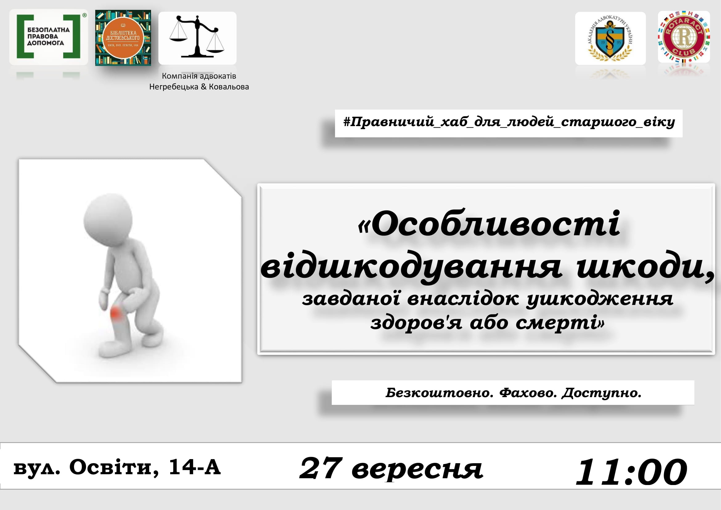 27 вересня 2018 року в 11:00 у Центральній районній бібліотеці імені Ф. М. Достоєвського (м. Київ, вул. Освіти, 14-а) відбудеться правоосвітній семінар з теми: «Особливості відшкодування шкоди, завданої внаслідок ушкодження здоров'я або смерті».