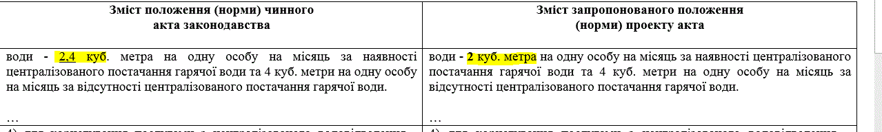 Зазначені цифри стосуються квартир, у яких не встановлені лічильники на газ. Так, діючу норму (3,3 куба на людину) замінять таким чином, що залежно від місяця сума у платіжках буде змінюватися. За наявності гарячого водопостачання, із квітня по вересень норма становитиме 5,8 куб. м, із жовтня по березень — 8,8 куб. м.