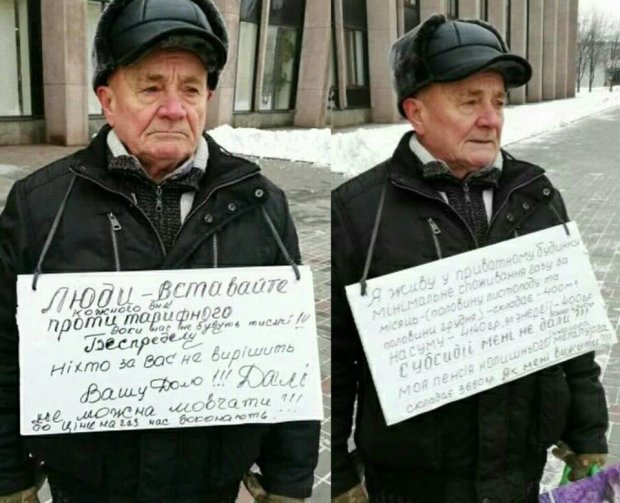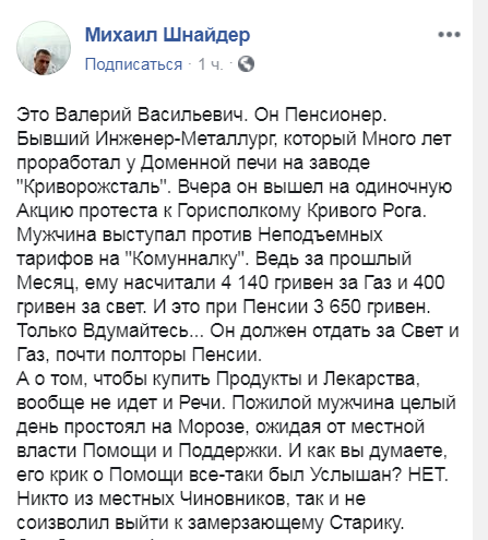 "Це Валерій Васильович. Він Пенсіонер. Колишній Інженер-Металург, який Багато років пропрацював у Доменної печі на заводі "Криворіжсталь". Вчора він вийшов на одиночну Акцію протесту до Міськвиконкому Кривого Рогу. Чоловік виступав проти Непідйомних тарифів на "Комунналку". Адже за минулий Місяць, йому нарахували 4 140 гривень за Газ та 400 гривень за світло. І це при Пенсії 3 650 гривень. Тільки Вдумайтеся... Він повинен віддати за Світло і Газ, майже півтори Пенсії. А про те, щоб купити Продукти і Ліки, взагалі не йдеться",- пише Шнайдер.