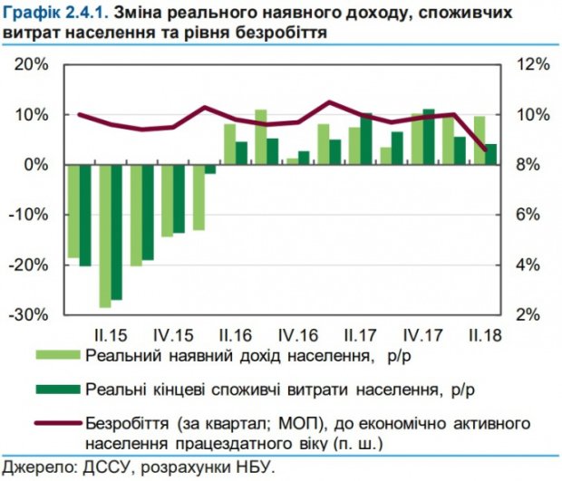 Фінансисти підкреслюють, що у 2018 році фінансовий стан домогосподарств продовжував поліпшуватися. У І півріччі 2018 року реальний наявний дохід населення зріс на 9,8% р/р, але поки становить 82% від рівня 2013 року.