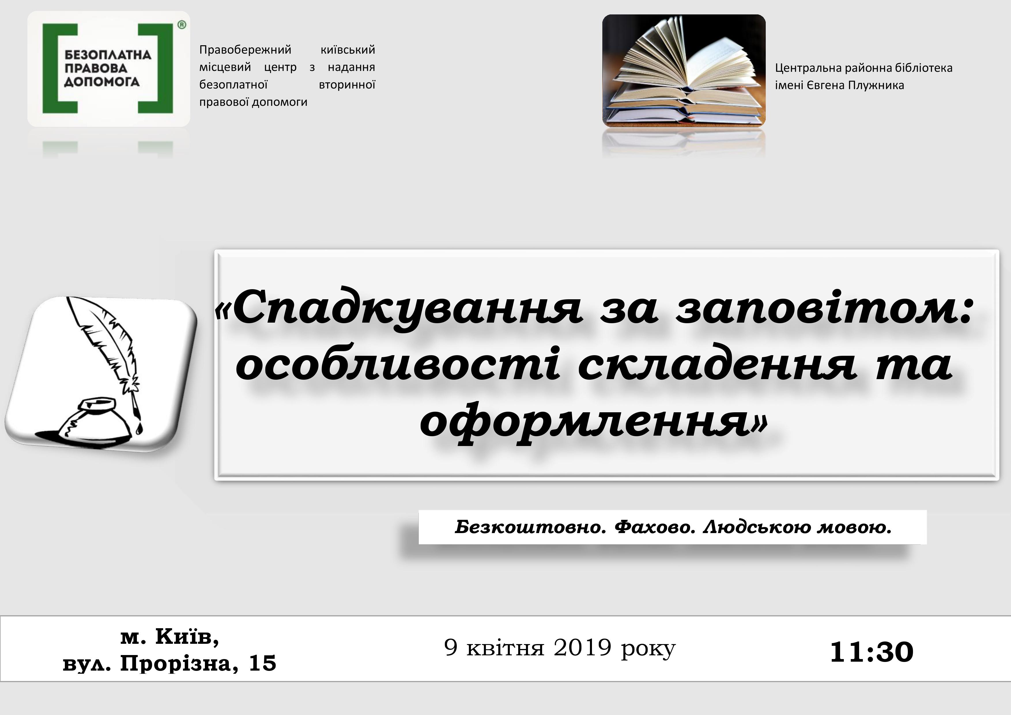 9 квітня 2019 року в 11:30 у Центральній районній бібліотеці імені Євгена Плужника (м. Київ, вул. Прорізна, 15) відбудеться правоосвітній семінар з теми: «Спадкування за заповітом: особливості складання та оформлення».