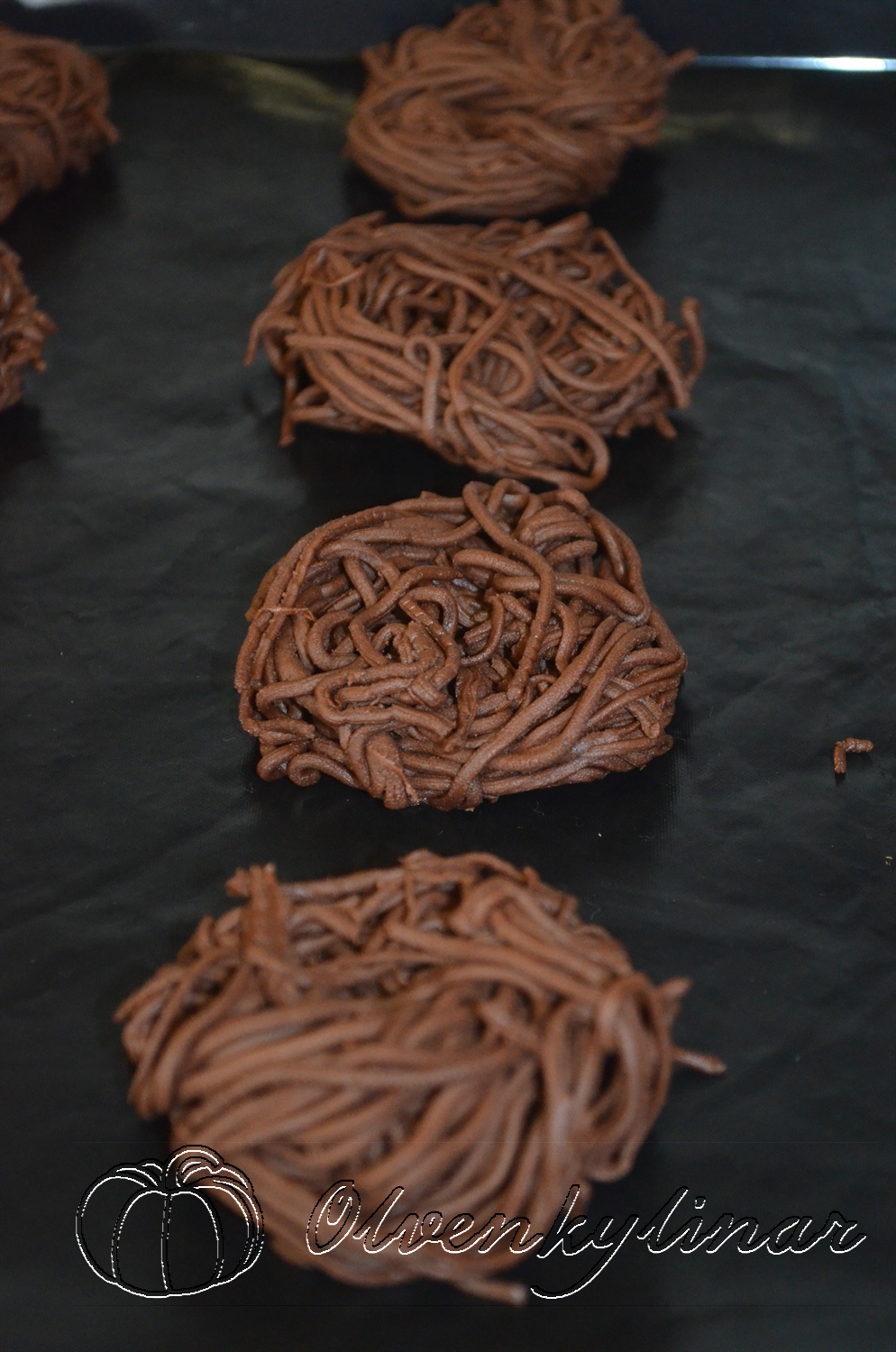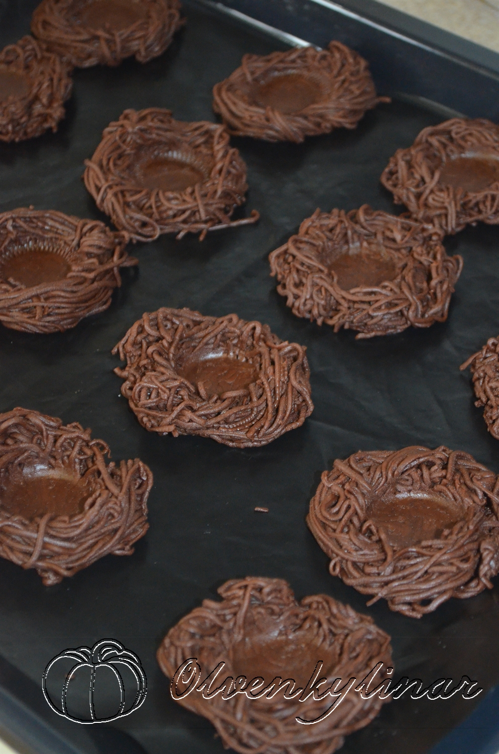 Готові гнізда викласти на застелене пергаментом деко.