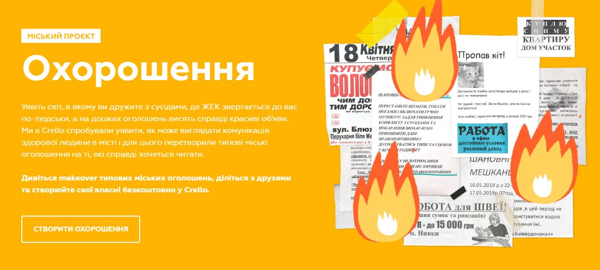 Український онлайн-редактор графіки Crello створив проєкт «Охорошення», який має врятувати міський простір, соцмережі та месенджери від неестетичних оголошень.
