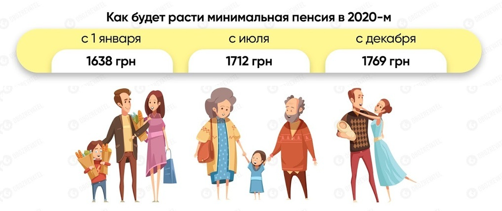 Підвищення пенсійних виплат буде відбуватися протягом 2020 року. Перша дата підвищення мінімальної пенсії - 1 липня. Розмір мінімальної пенсії становитиме 1 712 грн, друга дата - 1 грудня. Тоді українські пенсіонери зможуть отримувати мінімум 1 769 грн в місяць.