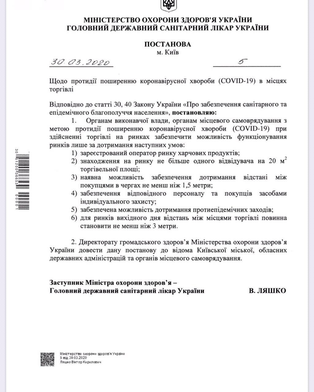 Відповідну постанову підписав заступник міністра охорони здоров'я, головний санітарний лікар Віктор Ляшко.