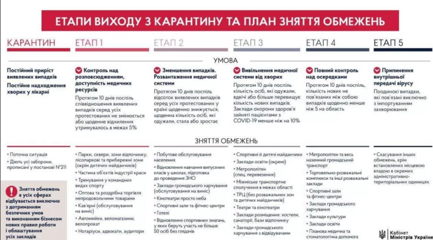 Також адміністрації потрібно буде не допускати функціонування зон, яких не торкнулося пом'якшення карантину, не допускати проведення масових заходів, роботу атракціонів.