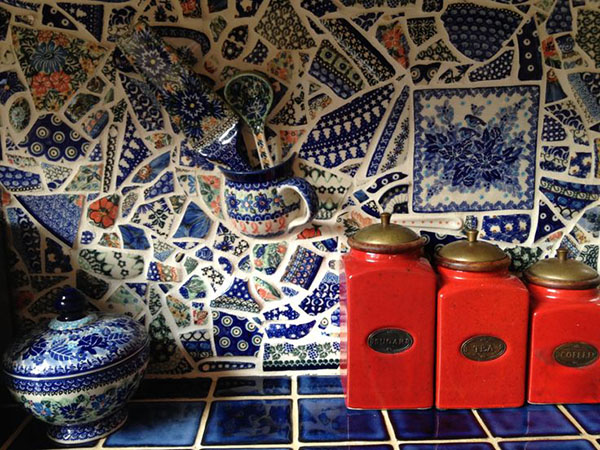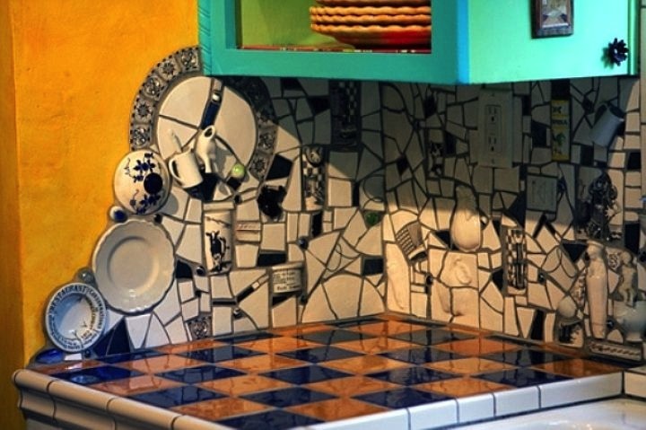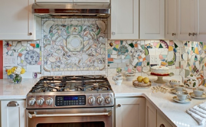 Наприклад, залишками битого посуду можете викласти робочу зону кухні. Тут фантазії немає меж. Уламки різної величини й кольору підбираються за розмірами й закріплюються за допомогою плиткового клею. Можна навіть створити певний орнамент. Розбитий посуд не гірше звичайної плитки буде захищати стіну від забруднень.